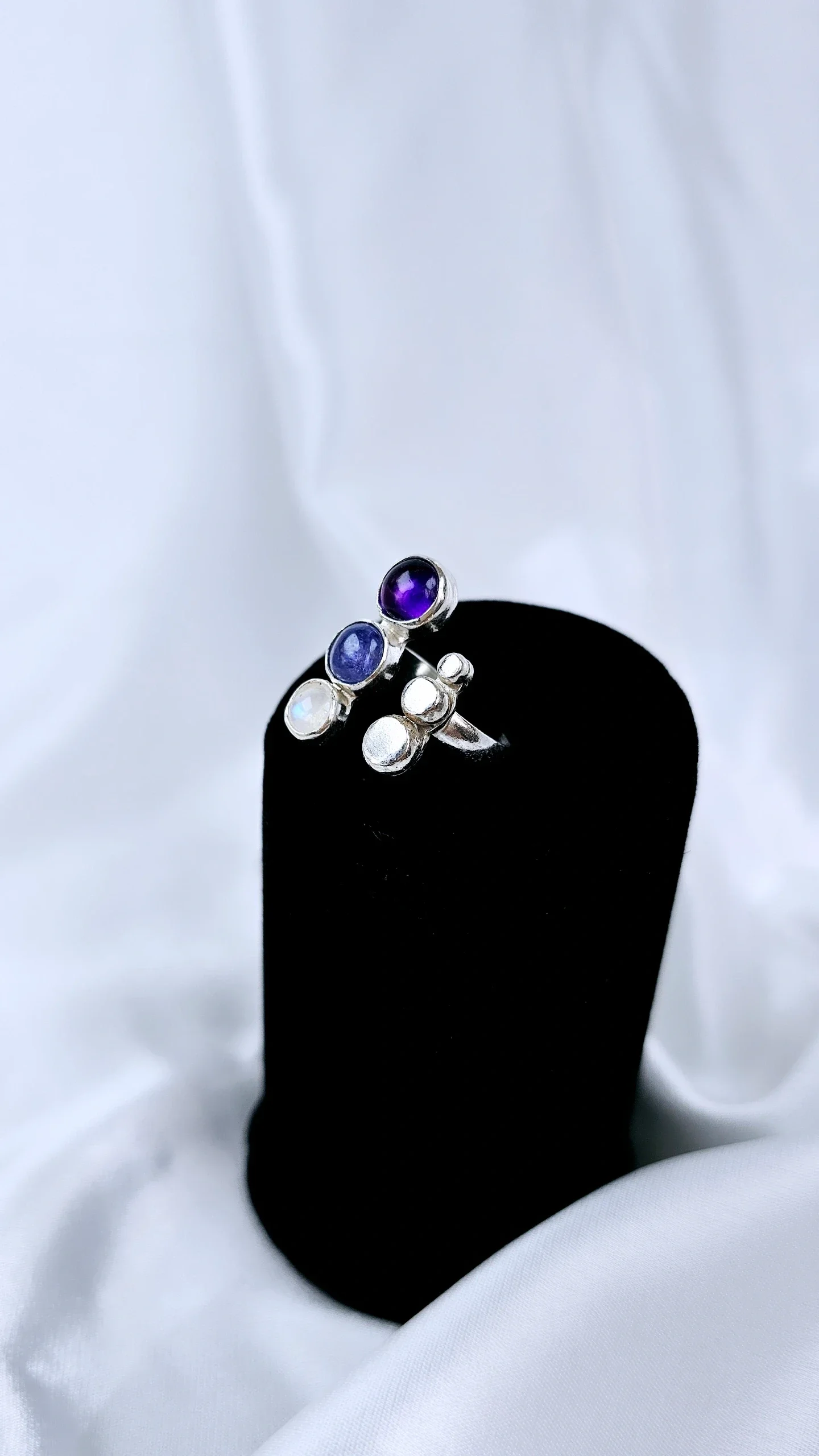 Handcrafted Sterling silver (.925) Ring set with natural gemstones in round shape > Amethyst / Tanzanite / Moonstone